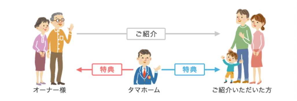 タマホームは、オーナー様と、オーナー様にご紹介いただいた方に特典をお渡しする、ご紹介制度をご用意しています。