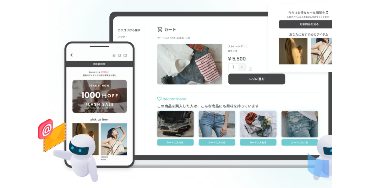 リアルタイムで顧客の閲覧履歴を解析し、おすすめするべき情報を素早く計算したうえでの、顧客の心理行動に合った商品の表示が行えます。また、レコメンドの成果を基とするABテストを自動改善し、成果の低いアルゴリズムセットは試すべきものに自動で入れ替え、最適化の停滞を防ぎます。