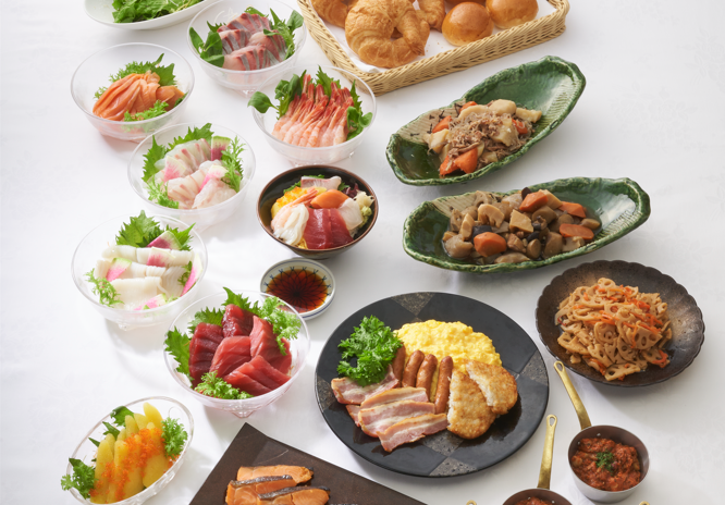 築地ならではの海鮮丼や和食バイキング「あかねくりや」、ホテルならではのシェフ自慢の洋食バイキング「MoeGiKURiYA」をお楽しみください。